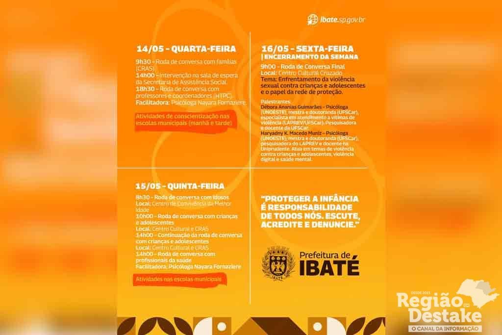 A cidade de Ibaté realiza, entre os dias 12 e 16 de maio, a Semana “Faça Bonito”, uma campanha de mobilização social voltada à conscientização, prevenção e enfrentamento da violência sexual contra crianças e adolescentes. Com o tema “O silêncio não protege. Denunciar é um ato de amor”, a iniciativa visa engajar a população e fortalecer a rede de proteção por meio de atividades educativas, rodas de conversa e intervenções em diferentes espaços públicos.