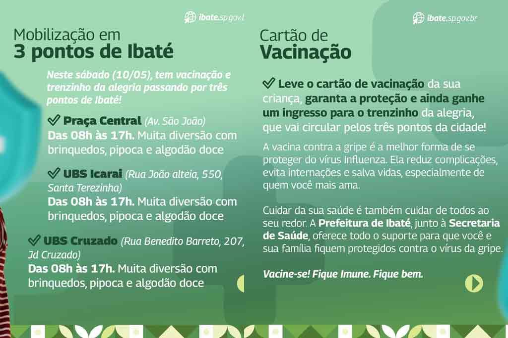 A Prefeitura de Ibaté realiza neste sábado, 10, uma grande mobilização de multivacinação contra a Influenza, com atividades voltadas à conscientização e ao aumento da cobertura vacinal na cidade. A ação ocorre das 8h às 17h em três pontos fixos: Praça Central, UBS Icaraí (Santa Terezinha) e UBS Cruzado (Jardim Cruzado).