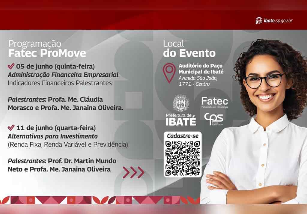 A Prefeitura de Ibaté, por meio da Secretaria Municipal de Gestão de Políticas Públicas para o Desenvolvimento Econômico e Social, em parceria com a Faculdade de Tecnologia – Fatec São Carlos, promoverá o “I Fatec ProMove”, que ocorrerá nos dias 05 e 11 de junho, às 19h, no auditório do Paço Municipal.