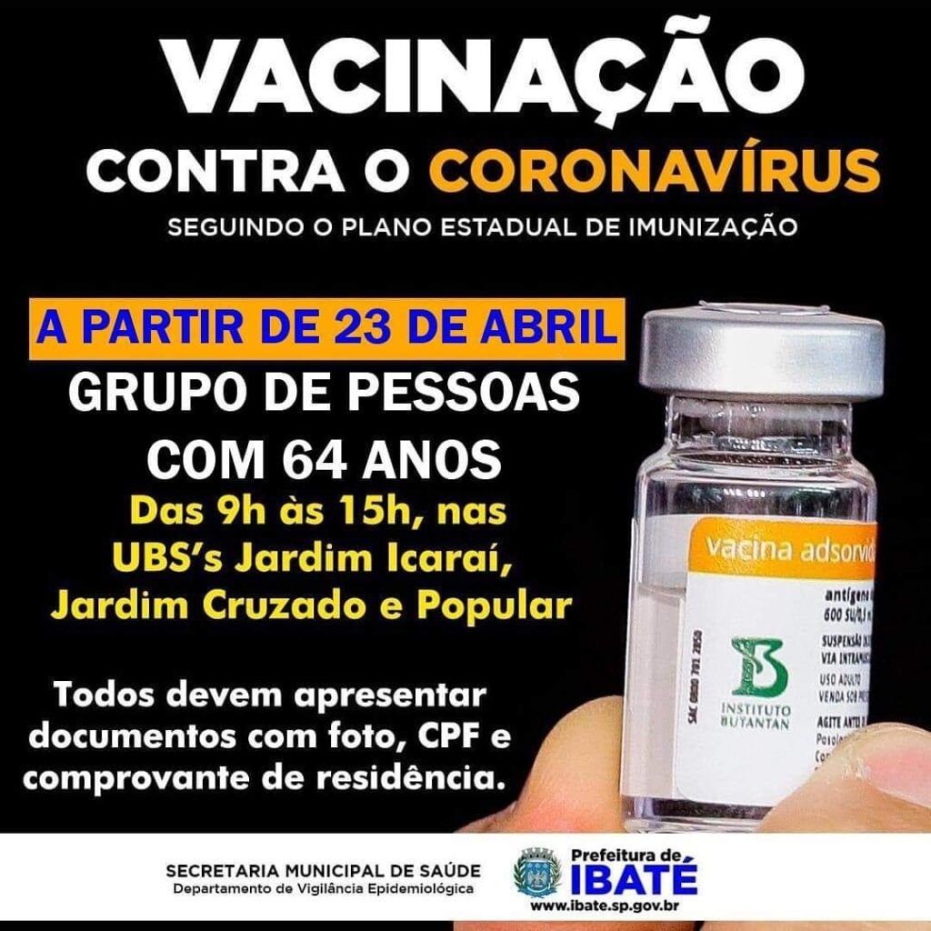 A Secretaria Municipal de Saúde de Ibaté, através da Vigilância Epidemiológica, informa que a vacinação contra a Covid-19 para o grupo de pessoas com 64 anos completos, foi antecipada para esta sexta-feira, 23 de abril.