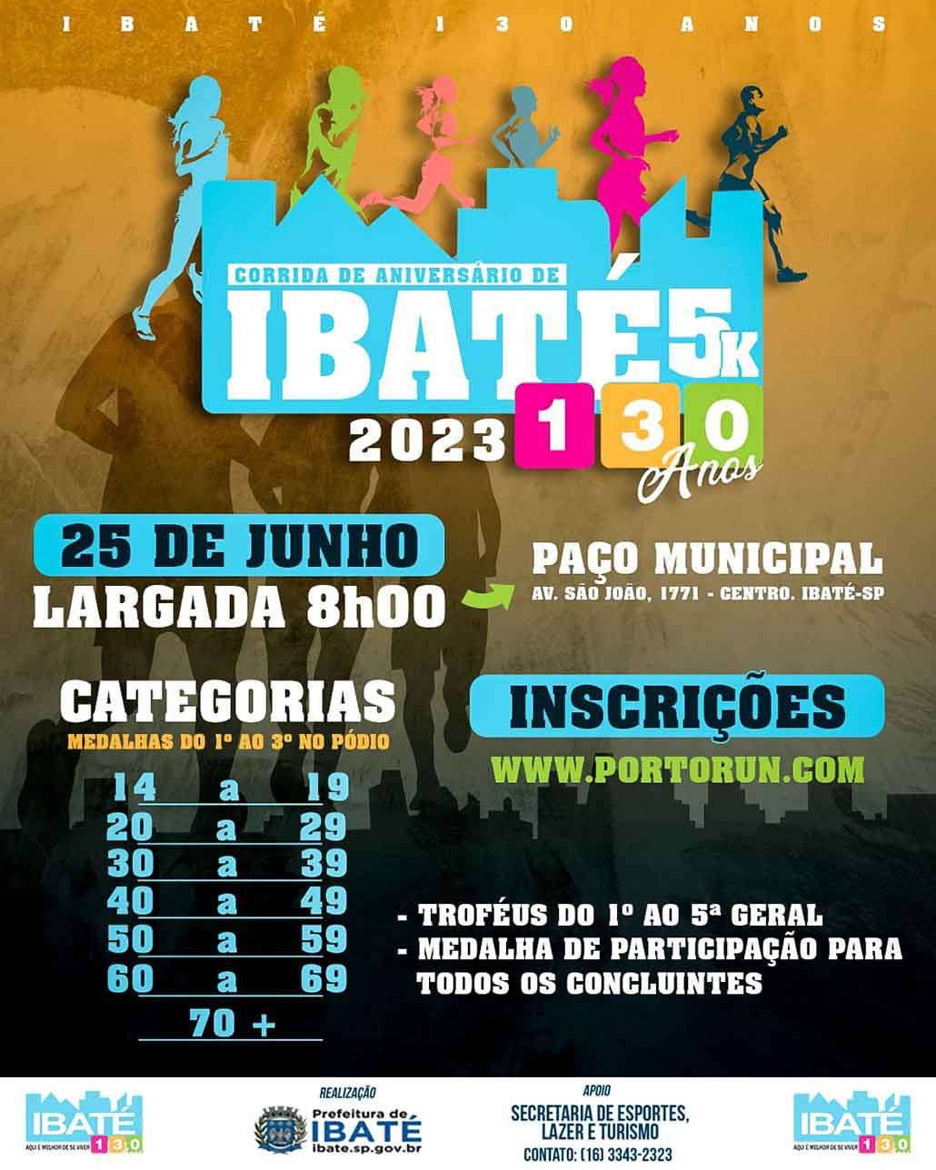 A Prefeitura de Ibaté, através da Secretaria Municipal de Esportes, informa que a partir do dia 24 de maio, estão abertas as inscrições para a “Corrida Pedestre 130 anos de Ibaté”, em comemoração ao aniversário do município.