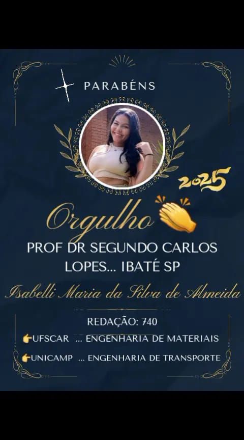 Após concluir o Ensino Médio na Escola Estadual Professor Segundo Carlos Lopes, Isabelli foi aprovada com honra e mérito em duas das mais renomadas universidades do país: a UFSCar (São Carlos) e a Unicamp (Limeira). Ela escolheu a UFSCar, onde cursará Engenharia de Materiais a partir de 2025.