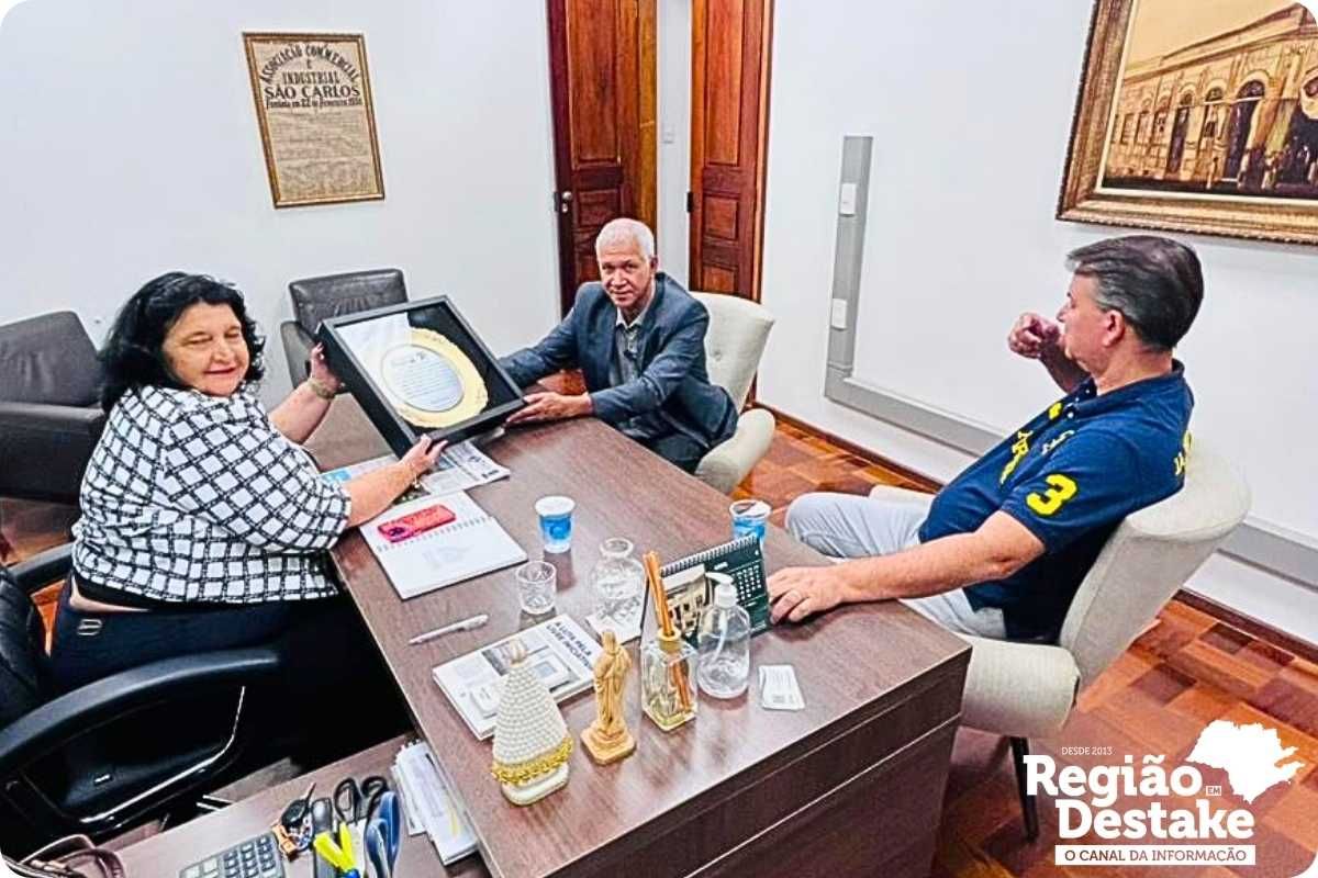 O presidente da Câmara Municipal de São Carlos, Lucão Fernandes (PP), entregou na manhã desta sexta-feira (27) uma placa de reconhecimento à presidente da Associação Comercial e Industrial de São Carlos (ACISC), Ivone Zanquim. A homenagem marca os 95 anos de fundação da entidade e reconhece o trabalho desenvolvido pela atual diretoria à frente da instituição, destacando a importância da ACISC para o fortalecimento do comércio e da economia local.