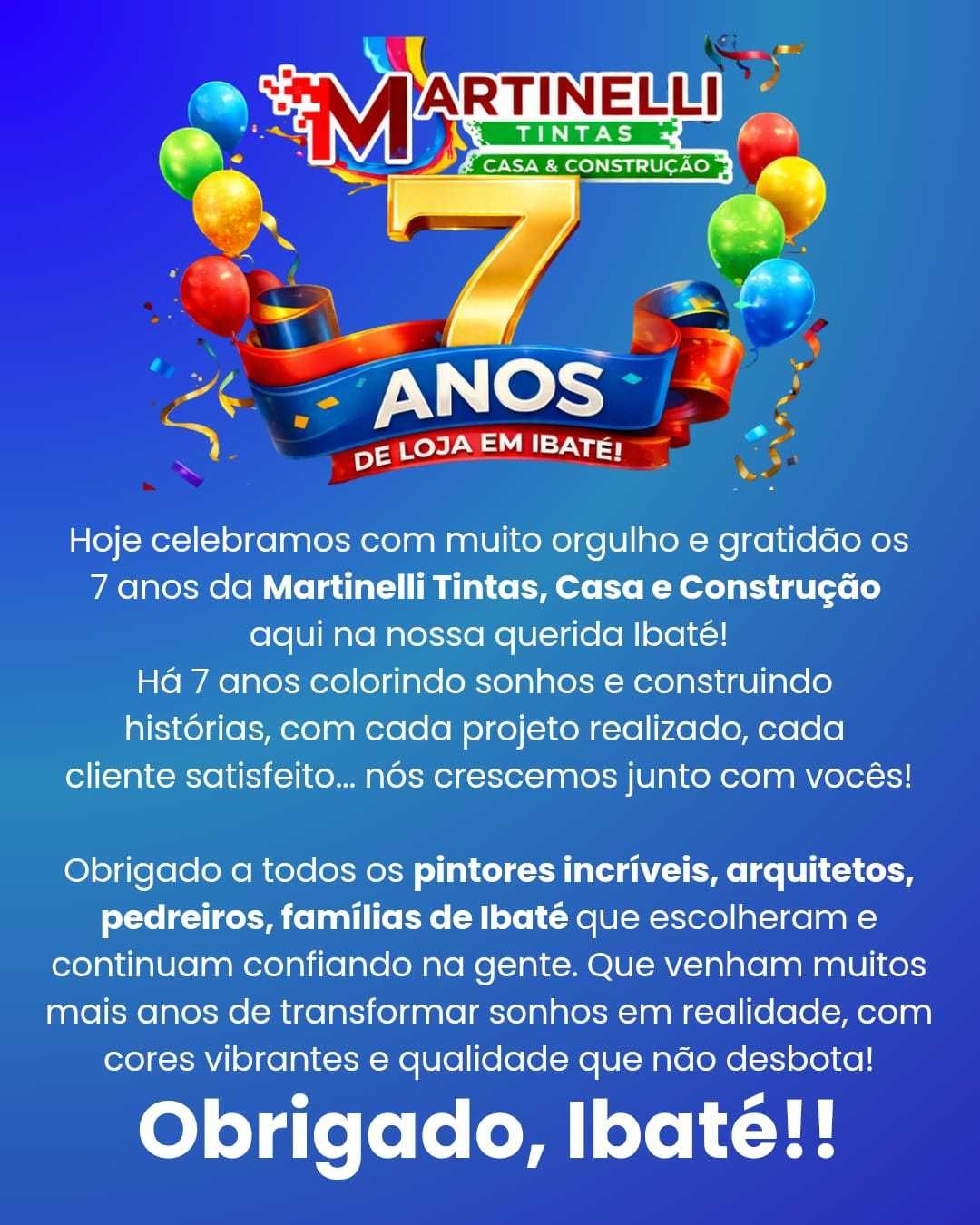 A Martinelli Tintas Casa & Construção celebra 07 anos de atuação em Ibaté com um marco importante: a consolidação da marca e a expansão da rede para outras quatro cidades da região. O crescimento é reflexo da confiança dos clientes, da qualidade dos produtos e do atendimento especializado que se tornaram a identidade da empresa.