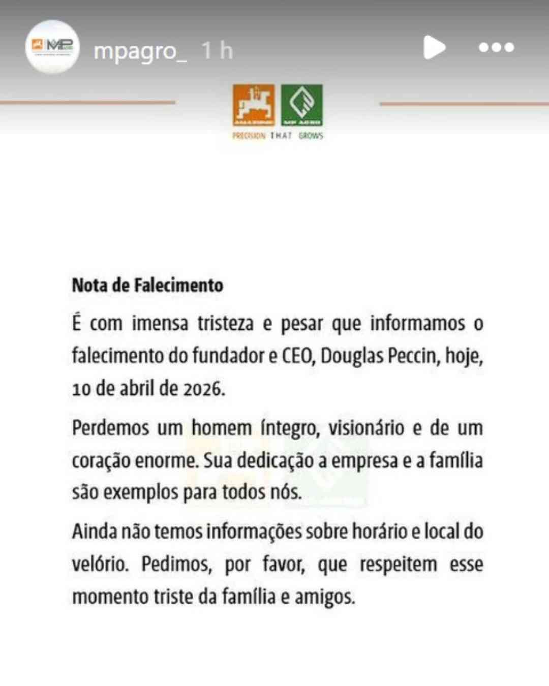 A MP Agro, de Ibaté, confirmou, por meio de nota divulgada nesta sexta-feira (10), a morte de seu fundador e CEO, Douglas Peccin. O comunicado foi publicado após um grave acidente registrado na manhã de hoje na BR-364, no km 78, nas proximidades do trevo de Caçu, na região sudoeste de Goiás. Na mensagem, a empresa lamenta a perda e descreve Peccin como “um homem íntegro, visionário e de um coração enorme”, destacando sua dedicação à empresa e à família.
