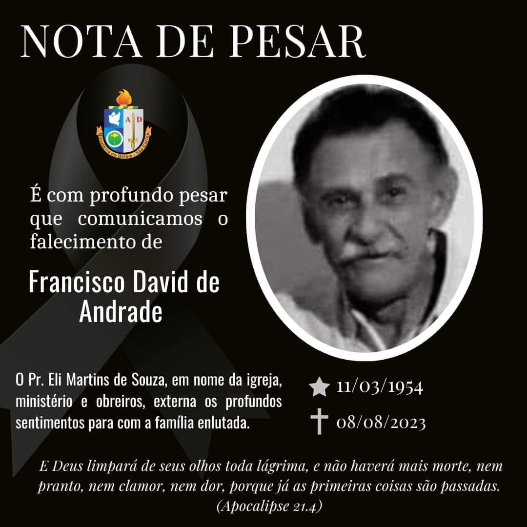 Faleceu na cidade de São Carlos, nesta terça-feira, 08, o Sr. Francisco David de Andrade, aos 69 anos de idade.
