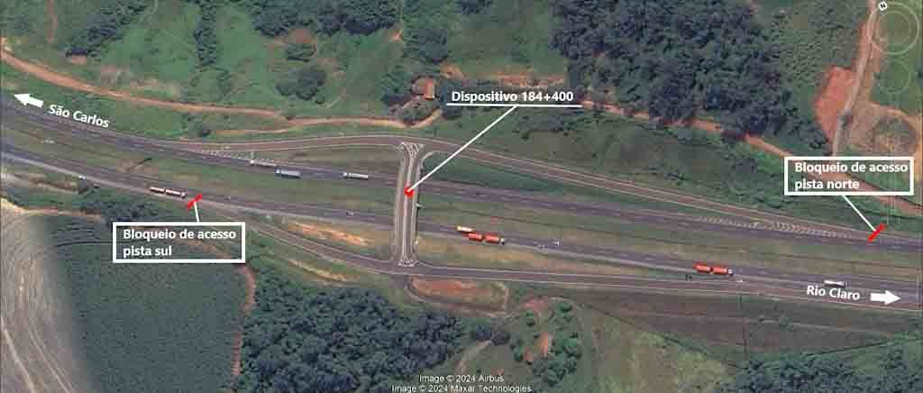 Em uma das intervenções dessa semana, programada para começar nesta terça-feira (9), será necessário fechar as alças de retorno, em ambos os sentidos, no km 184+400, próximo à praça de pedágio de Rio Claro. Para os motoristas que seguem no sentido Interior, a melhor opção será seguir adiante até o próximo dispositivo, localizado no km 187, e retornar. Para os usuários que estiverem no sentido Capital, a opção de retorno será no dispositivo do km 179.