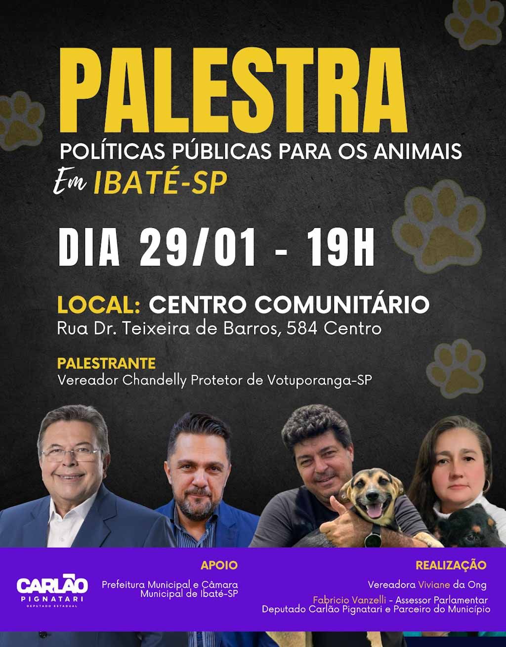 No dia 29 de janeiro, às 19h, o Centro Comunitário “João Baptista Lopes “, em Ibaté, localizado na Rua Dr. Teixeira de Barros, 584 – Centro, será o palco de uma importante palestra sobre Políticas Públicas para os Animais.