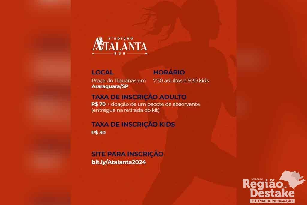 Em 24 de março, a cidade de Araraquara recebe a 3ª edição da corrida de rua Atalanta Run, além da 1ª Atalanta Kids. As competições terão início na praça do Tipuanas, com largadas às 7h30 para os adultos e 9h30 para as crianças entre 5 e 14 anos. O trajeto para os mais velhos conta com 6 quilômetros, enquanto os pequenos deverão percorrer entre 50 e 800 metros, a depender da idade.