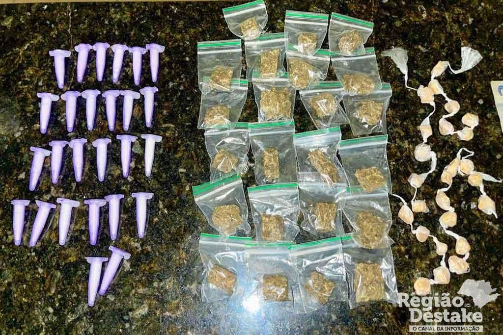 Durante a revista pessoal, o homem foi encontrado com um celular e uma pochete contendo R$ 590,00 em dinheiro. Com a ajuda de uma escada, a sacola foi recuperada do telhado e, ao ser aberta, revelou 26 eppendorfs de cocaína, 23 porções de maconha e 24 porções de crack.