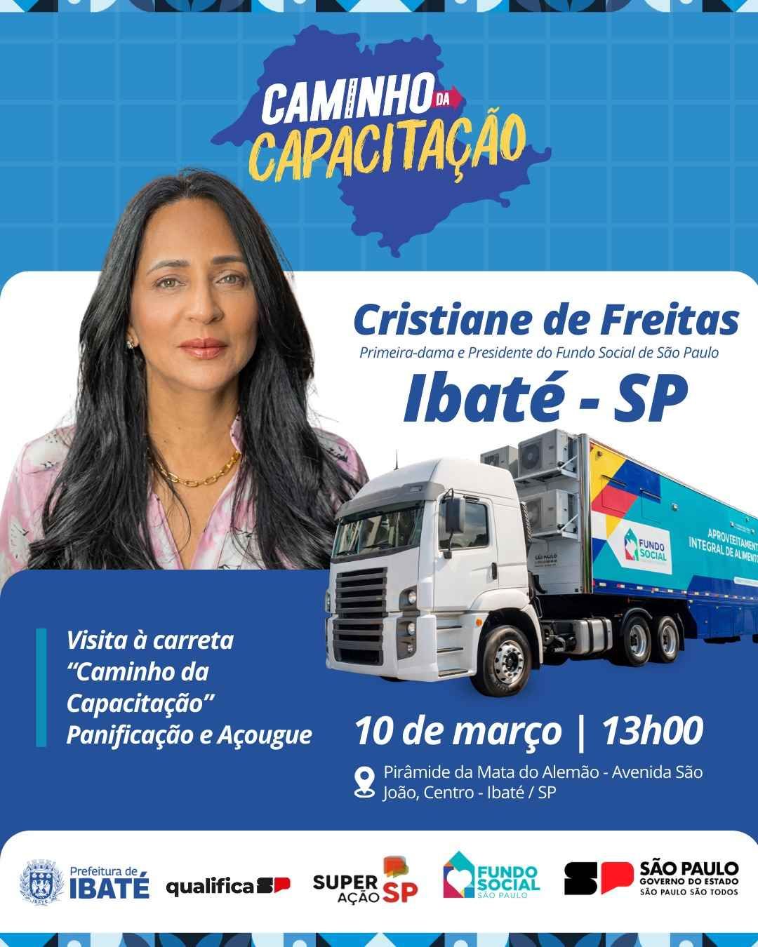 A cidade de Ibaté recebe nesta terça-feira (10) a visita da primeira-dama do Estado de São Paulo e presidente do Fundo Social de São Paulo, Cristiane Freitas. A agenda no município inclui a apresentação da carreta do programa Caminho da Capacitação, iniciativa voltada à qualificação profissional gratuita da população.