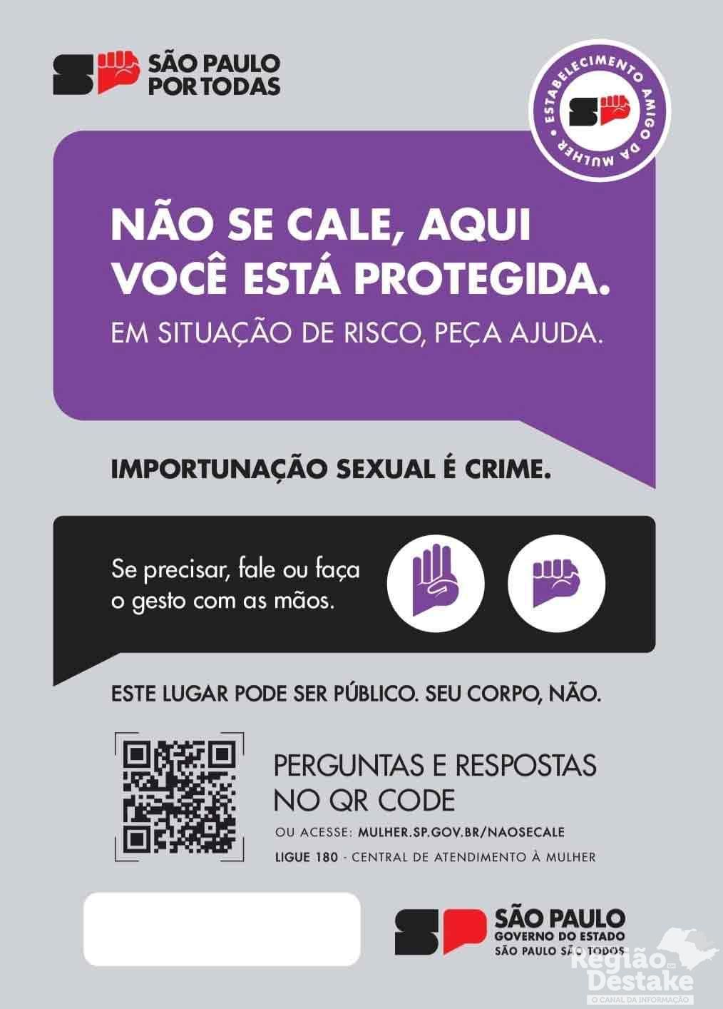 Todas as informações relacionadas ao tema, inclusive cartazes, folder/cartilha e link para inscrição no curso – gratuito – de capacitação para estabelecimentos e profissionais estão disponíveis no site https://www.mulher.sp.gov.br/naosecale/.