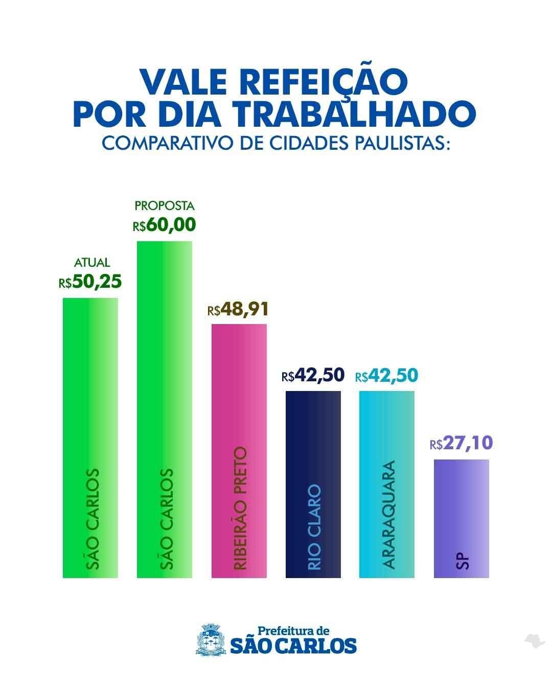 Em comparação, a cidade vizinha de Araraquara repassou aos seus servidores apenas o valor do IPCA, sem aumento real. Em 2022, o reajuste foi de 5%, em 2023 foi de 5%, e no ano passado foi de 6%. O ticket-refeição na Prefeitura de Araraquara é de R$ 850,00.