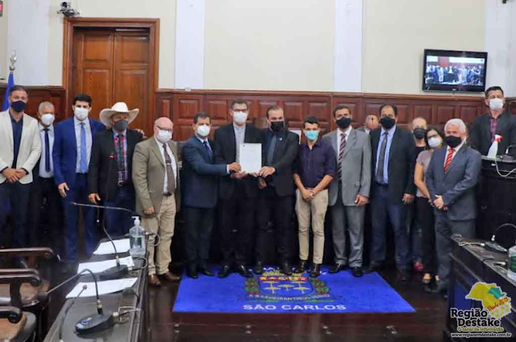 HOMENAGEM – Após a manifestação do bispo na Tribuna Livre, a Câmara fez a entrega oficial ao bispo de moção de congratulação, de autoria dos vereadores Gustavo Pozzi e André Rebello, pela nomeação de D.Luiz Carlos Dias como oitavo bispo da Diocese de São Carlos. Também esteve presente no Legislativo nesta terça-feira o Assessor de comunicação e imprensa da Mitra Diocesana de São Carlos, padre Robson Caramano.