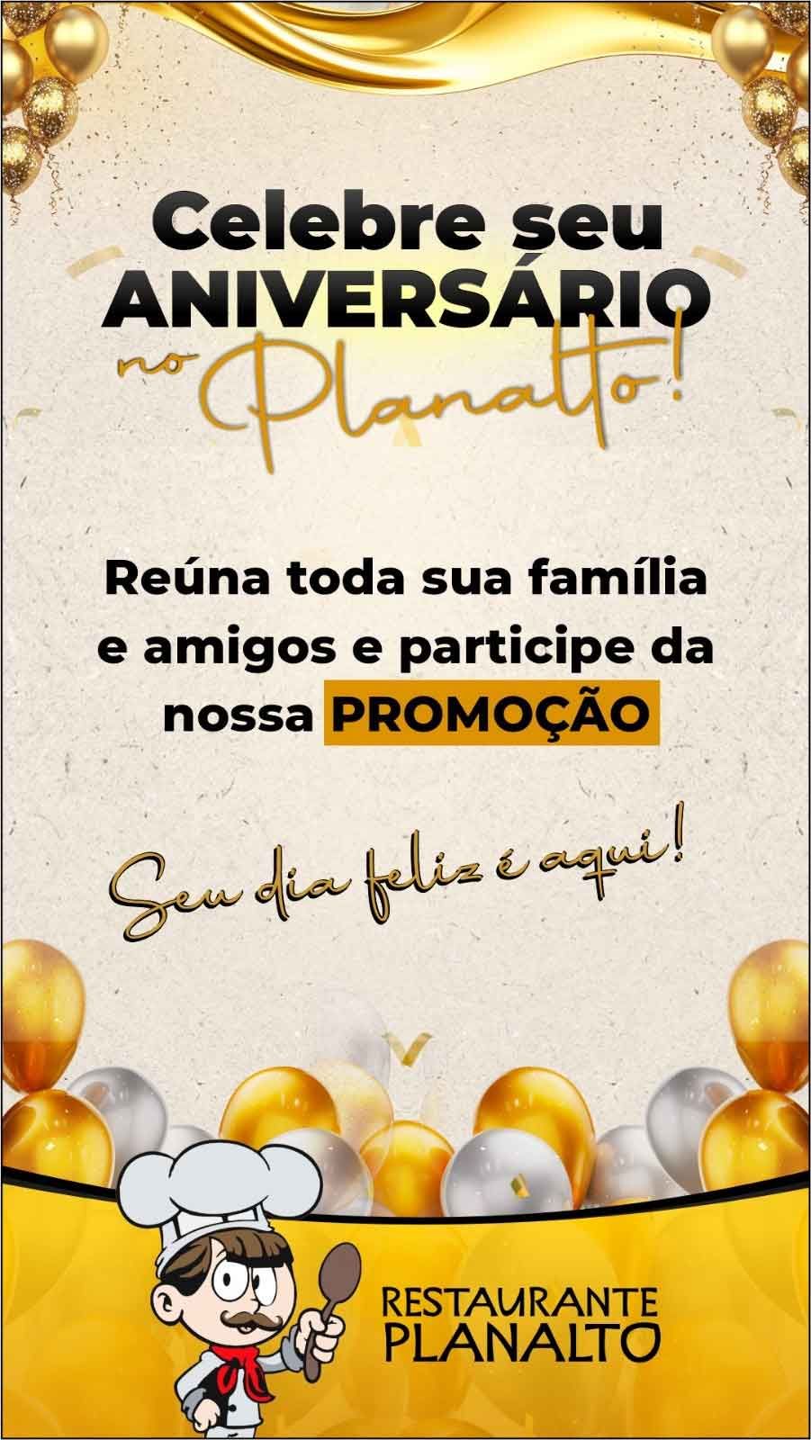 A ação promocional garante benefícios exclusivos para aniversariantes que escolhem o Planalto como destino para sua comemoração. De segunda a sábado, tanto no almoço quanto no jantar, os clientes que fazem aniversário no dia ganham descontos especiais ao reunir amigos para comemorar.
