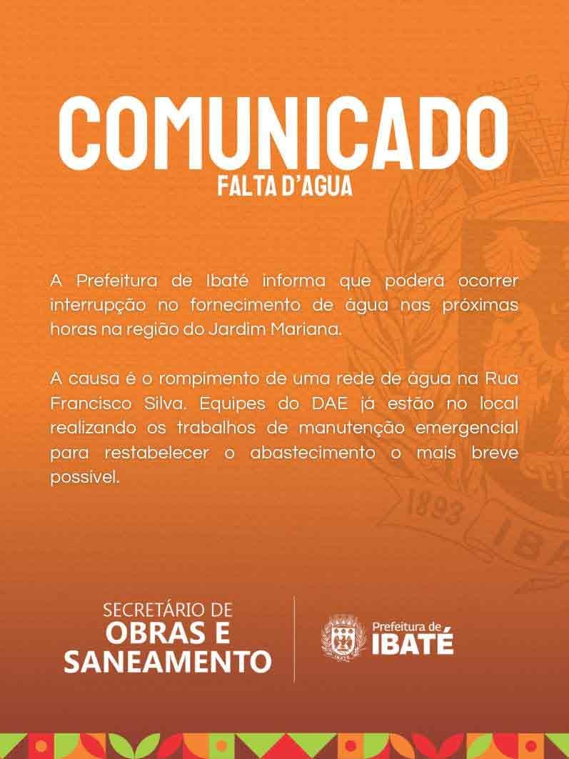 Moradores do Jardim Mariana, na cidade de Ibaté, podem enfrentar falta d’água nas próximas horas devido ao rompimento de uma rede de abastecimento na Rua Francisco Silva. A informação foi divulgada na manhã desta segunda-feira, 19, pela Prefeitura.