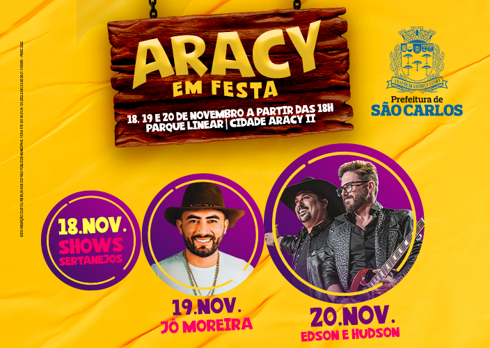 O final de semana será com festa no Cidade Aracy. Na sexta (18/11), sábado (19/11) e no domingo (20/11) a Prefeitura de São Carlos, por meio da Secretaria de Esportes e Cultura, realiza o Aracy em Festa no Parque Linear “Alex da Silva -Teté”, localizado na avenida João Martins de França com a Regit Arab, no bairro Cidade Aracy II.