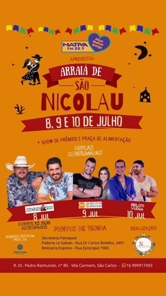 No domingo (10/07) é a vez do Arraiá da Santa Casa, com entrada gratuita, das 10h às 18h, em prol da Maternidade da Santa Casa de São Carlos. Uma oportunidade para almoçar em família, participar do bingo beneficente e ainda curtir os shows de Beloti e Viana e Cleber Harrison Trio.