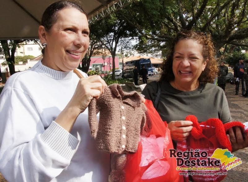 A aposentada Valquíria Marques confeccionou roupinhas de tricô para bebês com linhas doadas pelas amigas. “É muito bom poder colaborar. Eu passo o tempo e ajudo as pessoas que precisam. Fiz questão de trazer a doação”, afirmou ela.