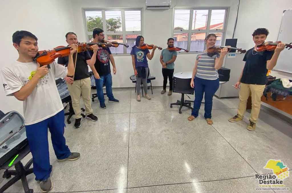 Já na primeira aula os alunos tiveram contato com os instrumentos de cordas como violoncelo, viola clássica, contrabaixo e instrumentos de percussão.
