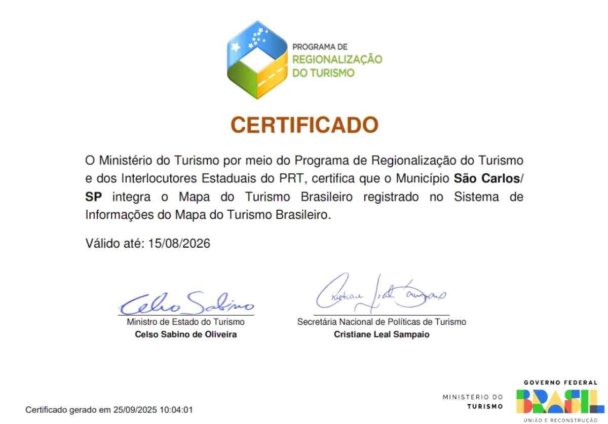 São Carlos acaba de ser novamente certificada no Mapa do Turismo Brasileiro 2025, uma das principais ferramentas do Ministério do Turismo (MTur) para orientar investimentos e políticas públicas no setor. O município alcançou a classificação máxima, como “Município Turístico – Nível 1”, reconhecimento que consolida sua posição entre os principais destinos do país.