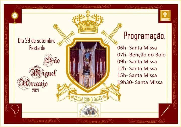 Dia 29 de setembro a Igreja Católica comemora o dia dos Arcanjos São Miguel, São Gabriel e São Rafael. Em São Carlos a paróquia São Miguel Arcanjo que fica na rua Antônio Gigliote nº 285 no Jardim Tangará estará comemorando a festa do seu padroeiro São Miguel.