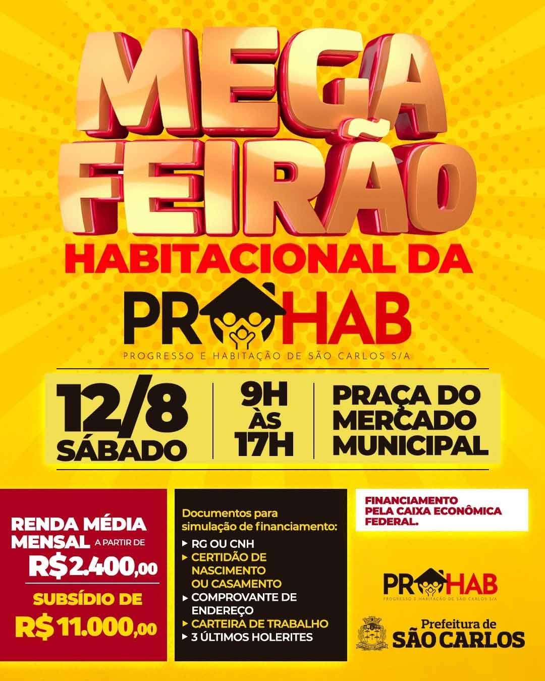 A Prefeitura de São Carlos, por meio da Progresso e Habitação São Carlos (PROHAB), em parceria com o Casa Paulista, programa habitacional do Governo do Estado de São Paulo, vai realizar no sábado, dia 12 de agosto, na Praça do Mercado Municipal, das 9h às 17h, o Mega Feirão Habitacional.