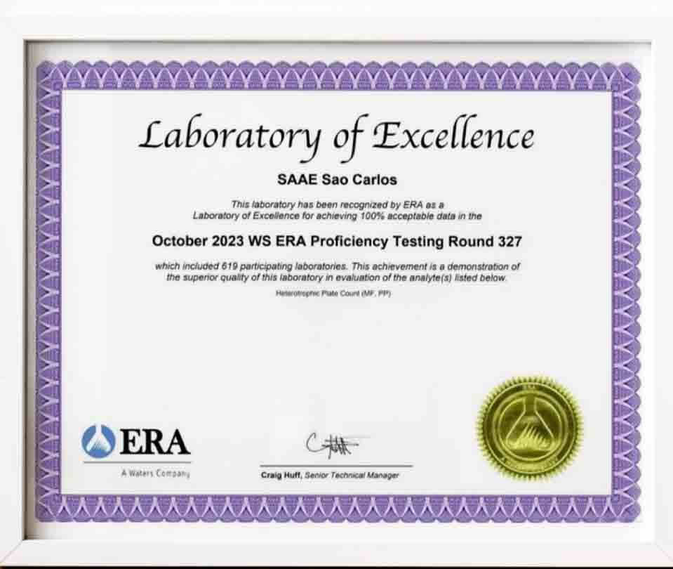 Os laboratórios de controle de qualidade da água do Serviço Autônomo de Água e Esgoto de São Carlos (SAAE), que funcionam na Estação de Tratamento de Água – ETA Vila Pureza, na Av. Dr. Carlos Botelho, foram classificados como de excelência pelo Programa de Ensaios de Proficiência ERA A Waters Company do Colorado – EUA, após uma avaliação que ocorreu em outubro de 2023.