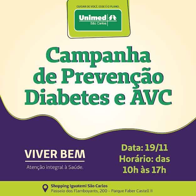 A Unimed São Carlos, em parceria com o Shopping Iguatemi São Carlos, realizará no próximo sábado, 19/11, um evento sobre prevenção ao Diabetes e Acidente Vascular Cerebral (AVC), que acontecerá no espaço Iguatemi, localizado ao lado da loja Riachuelo, das 10h às 17h. A ação, aberta ao público, será gratuita e visa orientar a população sobre os riscos do Diabetes e AVC, além de estimular a prevenção dessas doenças.