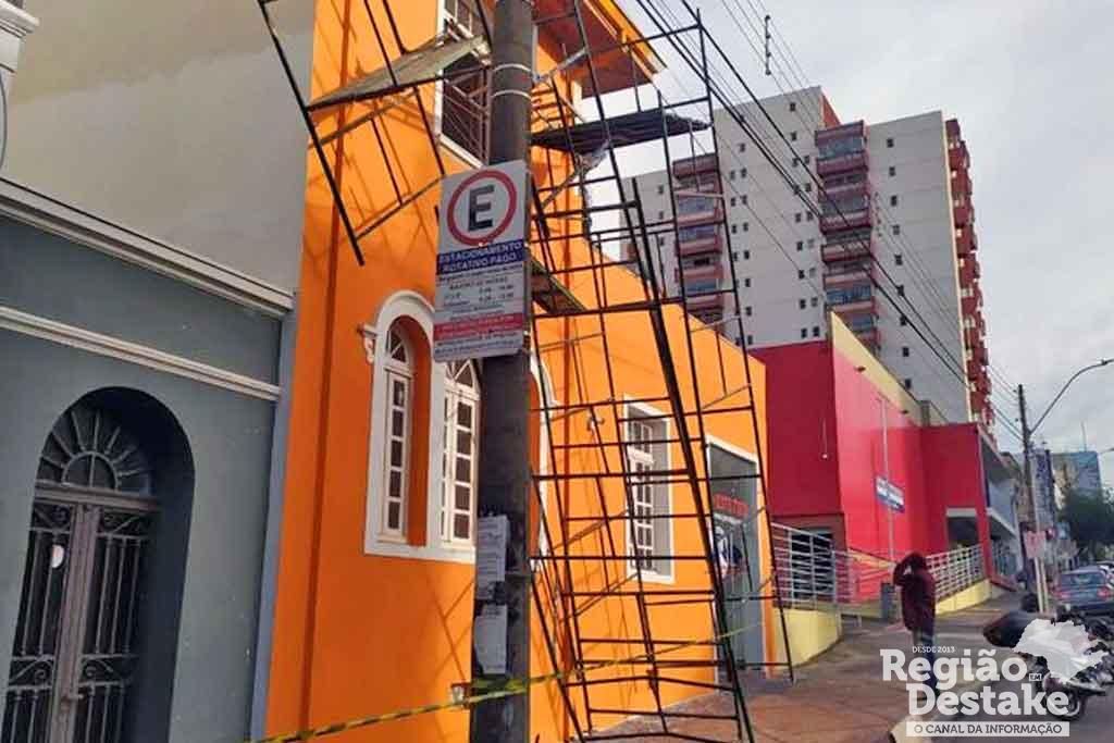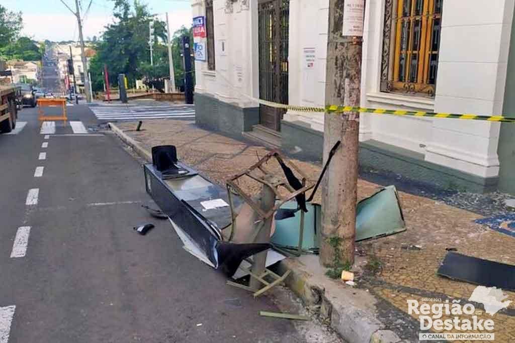 O impacto foi forte e o totem arremessado contra duas torres de andaimes que estão instaladas em frente ao Jornal Primeira Página. Pintores chegaram e amarraram os andaimes, já que alguns ficaram em contato com a fiação elétrica.