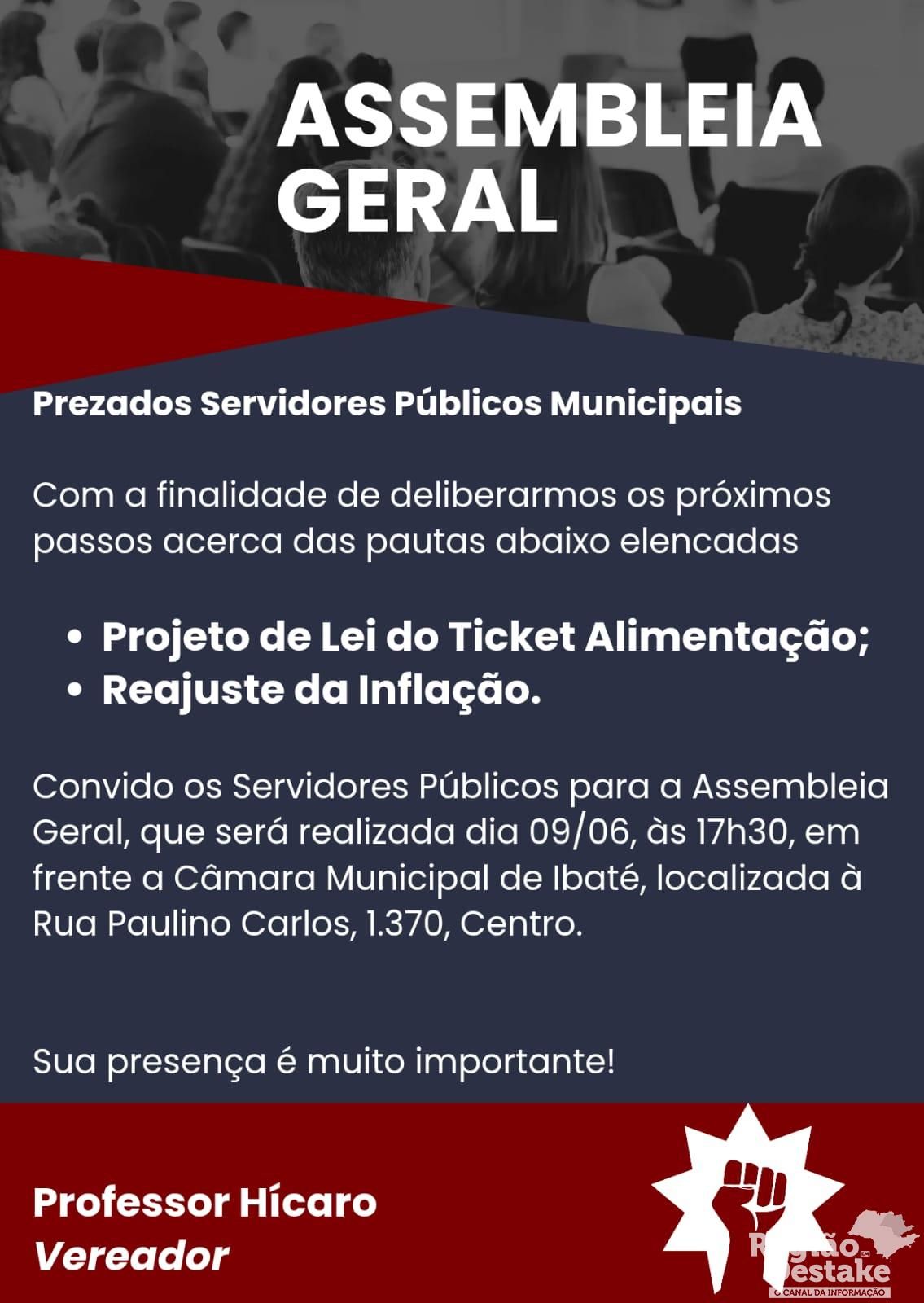 Os servidores públicos municipais de Ibaté estão sendo convocados para uma Assembleia Geral nesta segunda-feira (09), às 17h30, em frente à Câmara Municipal da cidade, localizada na Rua Paulino Carlos, nº 1.370, no Centro.