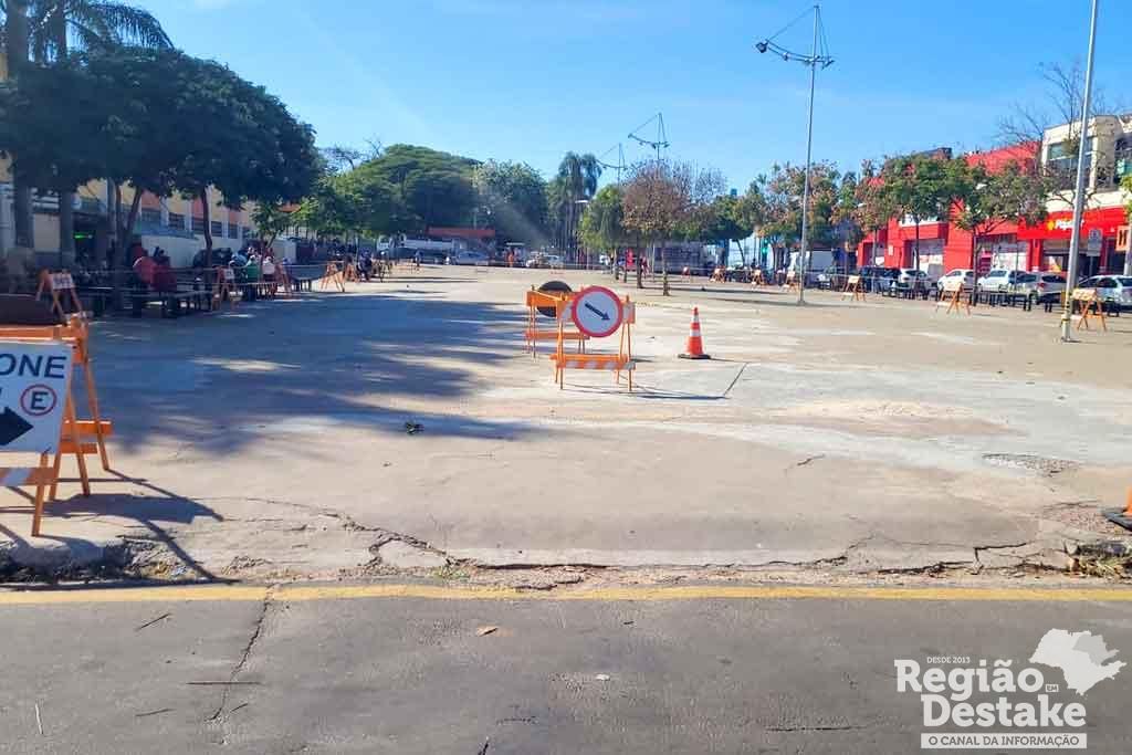 A sinalização provisória está sendo realizada com cavaletes para delimitação dos espaços de estacionamento de veículos e trânsito de pedestres.