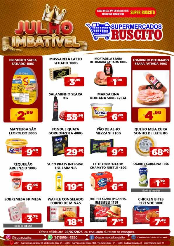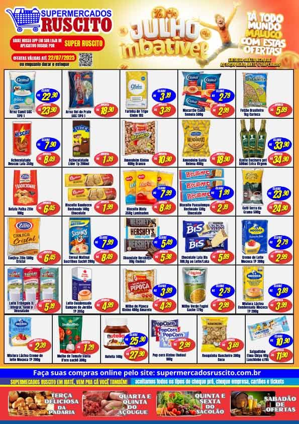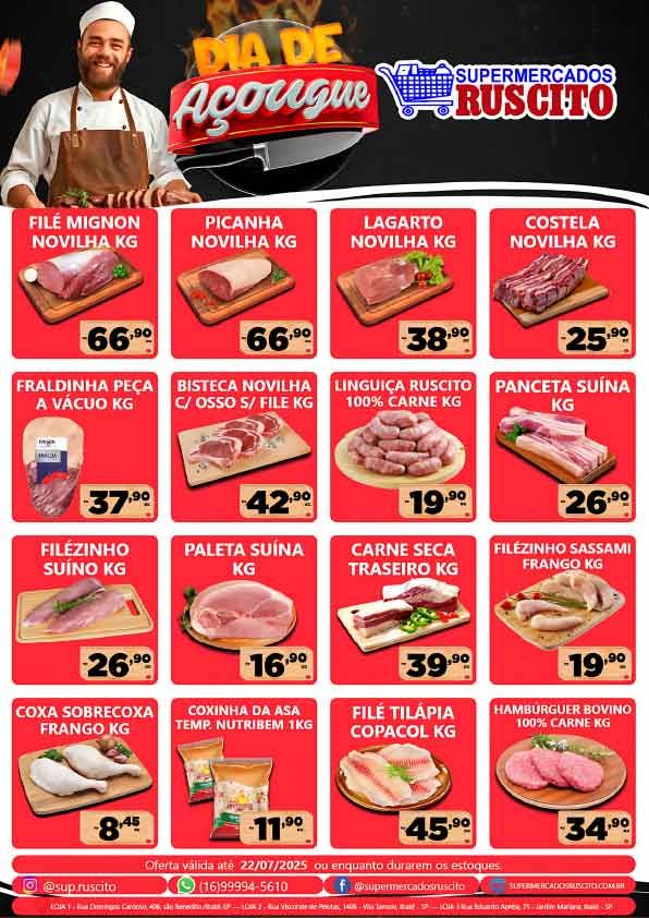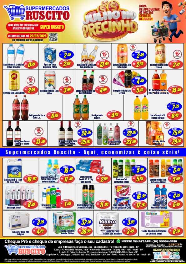 Além das tradicionais promoções semanais — como a “Terça do Açougue”, a “Terça Deliciosa da Padaria” e a “Quinta e Sexta do Sacolão” — o Ruscito oferece um catálogo diversificado de produtos alimentícios, bebidas, itens de higiene, limpeza e perfumaria com preços acessíveis, além de marcas reconhecidas no mercado.
