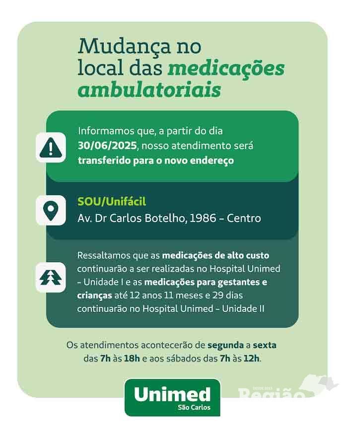 Com o objetivo de melhorar o atendimento aos beneficiários, a Unimed São Carlos informa que, a partir do dia 30 de junho de 2025, o serviço de medicações ambulatoriais passará a ser realizado no novo endereço: SOU/Unifácil, localizado na Av. Dr. Carlos Botelho, 1986 – Centro.
