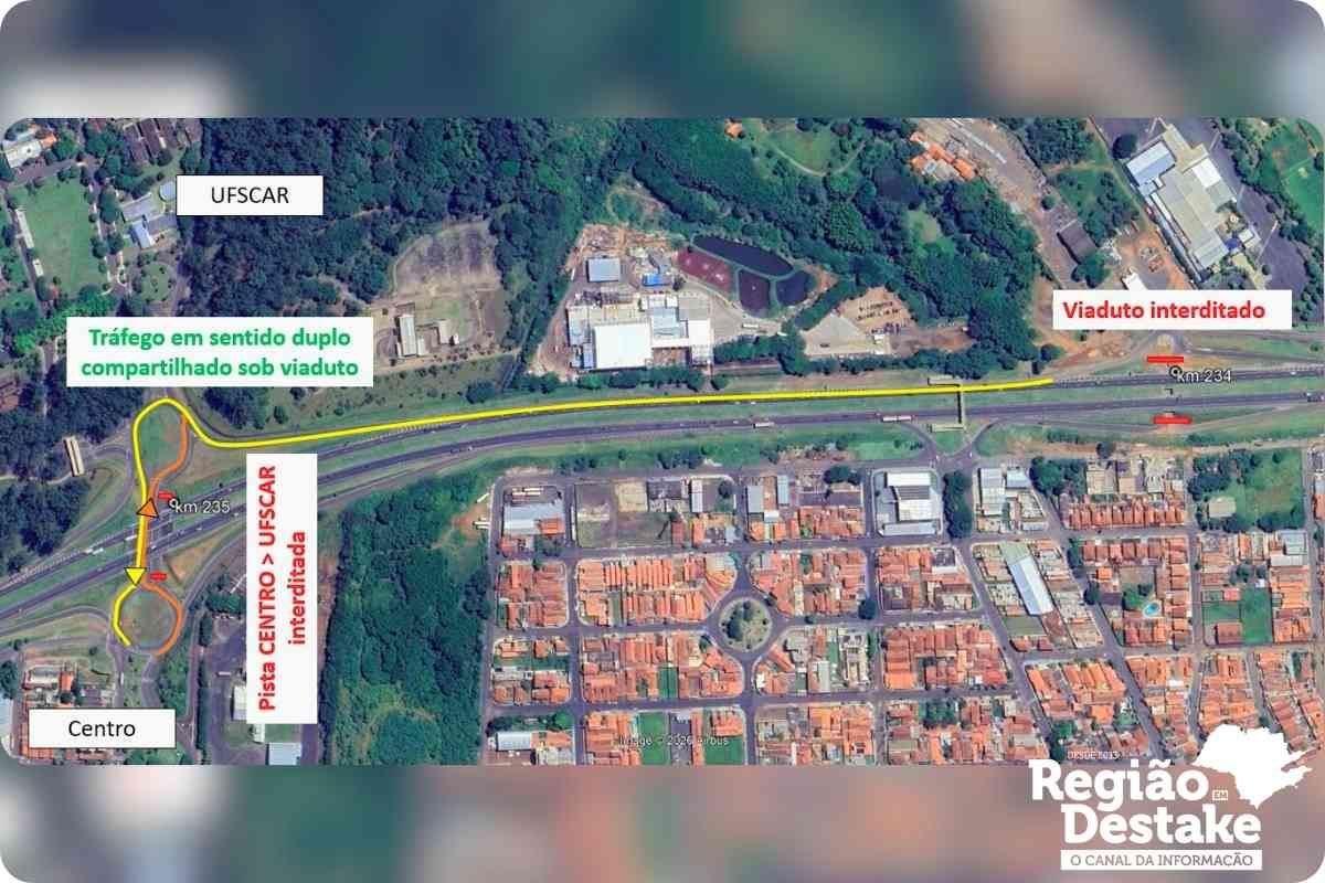Já no viaduto da Vila Brasília/Country Club, haverá fechamento total da estrutura até sexta-feira (6), exclusivamente no período diurno. A interdição ocorre para a implantação de um passeio metálico. Como rota alternativa, os motoristas deverão utilizar o dispositivo do quilômetro 235, na região da Universidade Federal de São Carlos (UFSCar), que funcionará temporariamente em mão dupla sob o viaduto, com uma faixa por sentido.